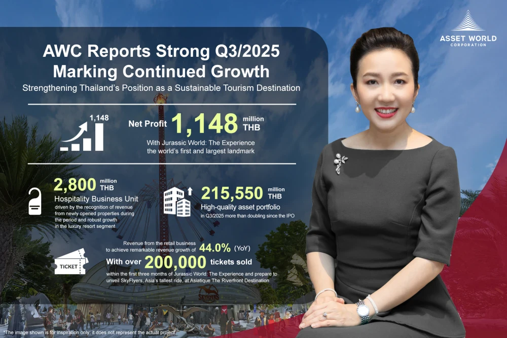 - AWC’s high-quality asset portfolio reached THB 215,550 million in Q3/2025, more than doubling since the IPO and increasing 10.4% YoY. The Company continues to advance its Sustainable Growth-Led Strategy and is preparing to unveil Sky Flyer, Asia’s tallest ride, at Asiatique The Riverfront Destination later this year to celebrate the festive season and reinforce Bangkok and Thailand’s position as a global sustainable tourism destination.